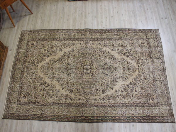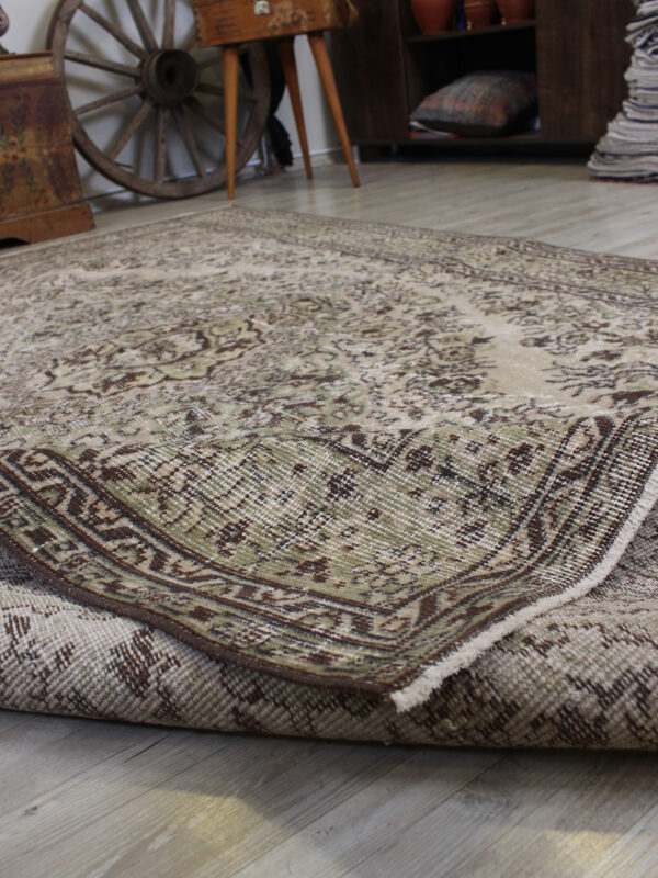 Anadolu’nun yüzyıllık el sanatları geleneğini yansıtan bu özel halı, 1980 öncesi tamamen el dokuması olarak hazırlanmıştır. Doğal yün ve pamuk ipliklerinden dokunan halı, geleneksel tekniklerle işlenmiş, traşlanıp temizlenerek modern vintage tarzına uygun hale getirilmiştir.