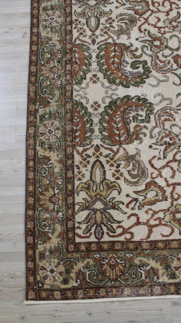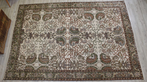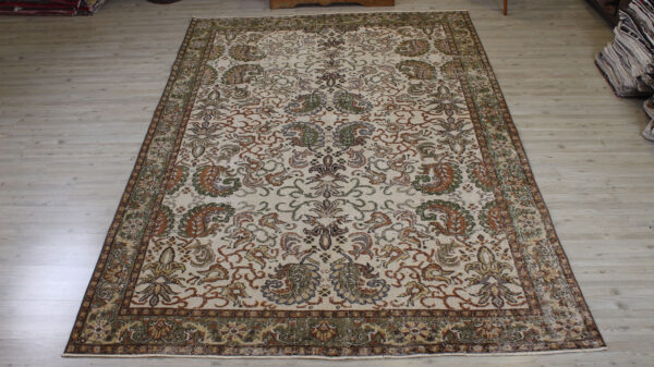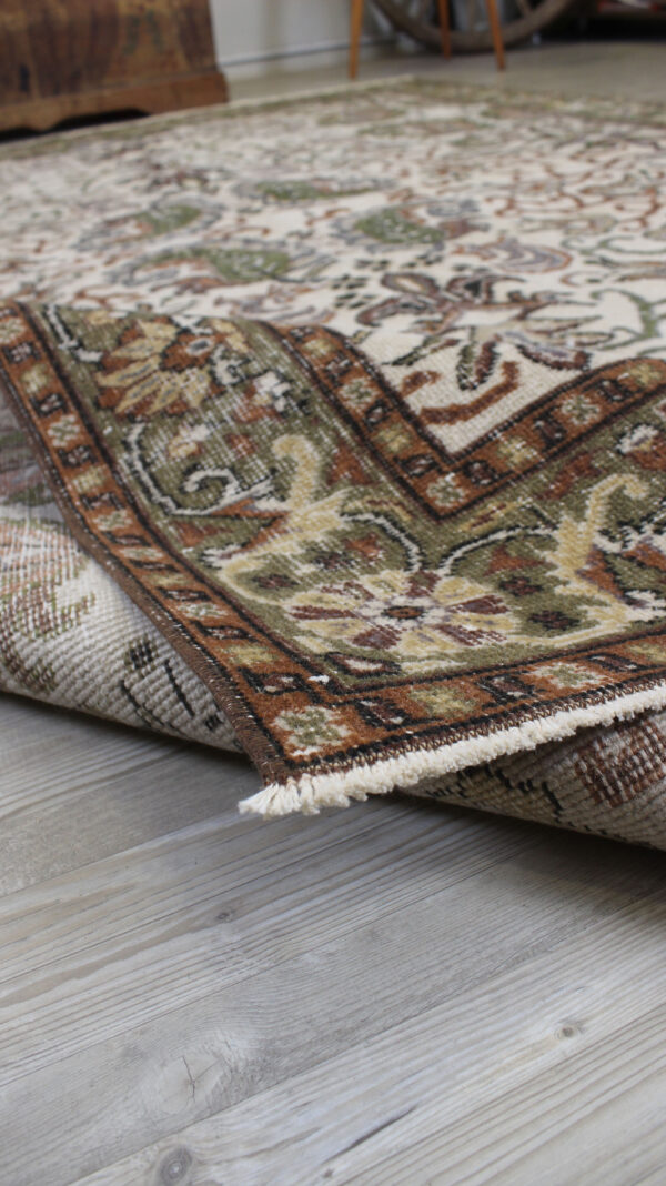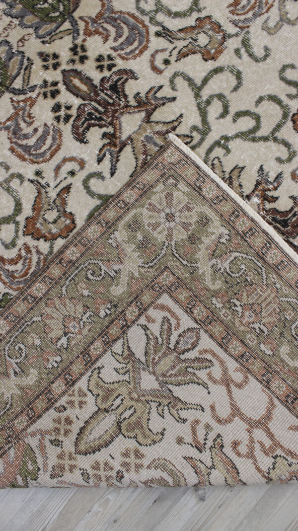 Anadolu’nun yüzyıllık el sanatları geleneğini yansıtan bu özel halı, 1980 öncesi tamamen el dokuması olarak hazırlanmıştır. Doğal yün ve pamuk ipliklerinden dokunan halı, geleneksel tekniklerle işlenmiş, traşlanıp temizlenerek modern vintage tarzına uygun hale getirilmiştir.