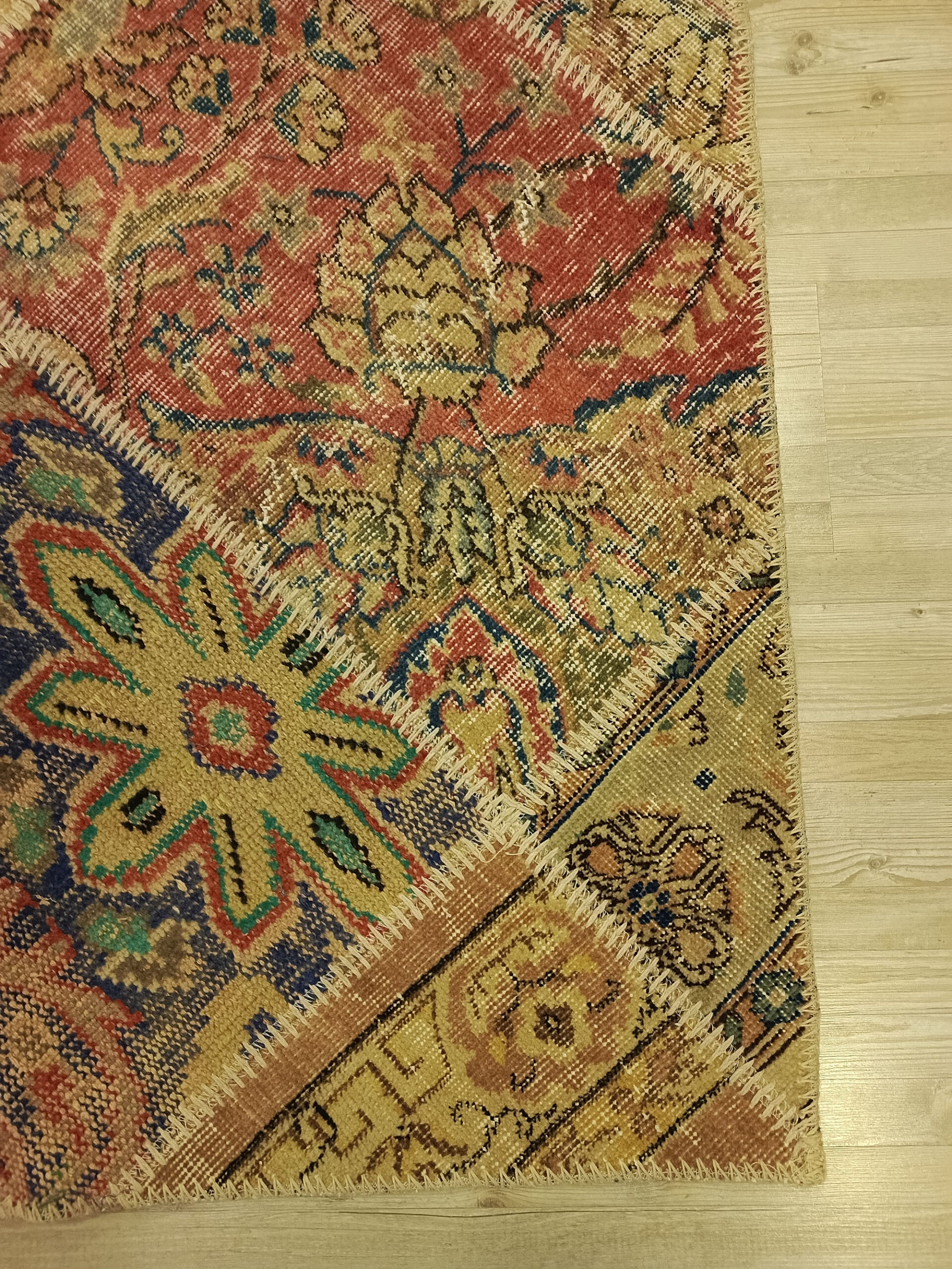 Yaklaşık 40 yıllık geçmişine rağmen, bu halı modern bir estetik sunar. Doğal yapısı korunmuş, herhangi bir renklendirme ya da büyük onarımlar yapılmamıştır. Özenle traşlanmış ve temizlenerek yeniden kullanıma hazır hale getirilmiştir.