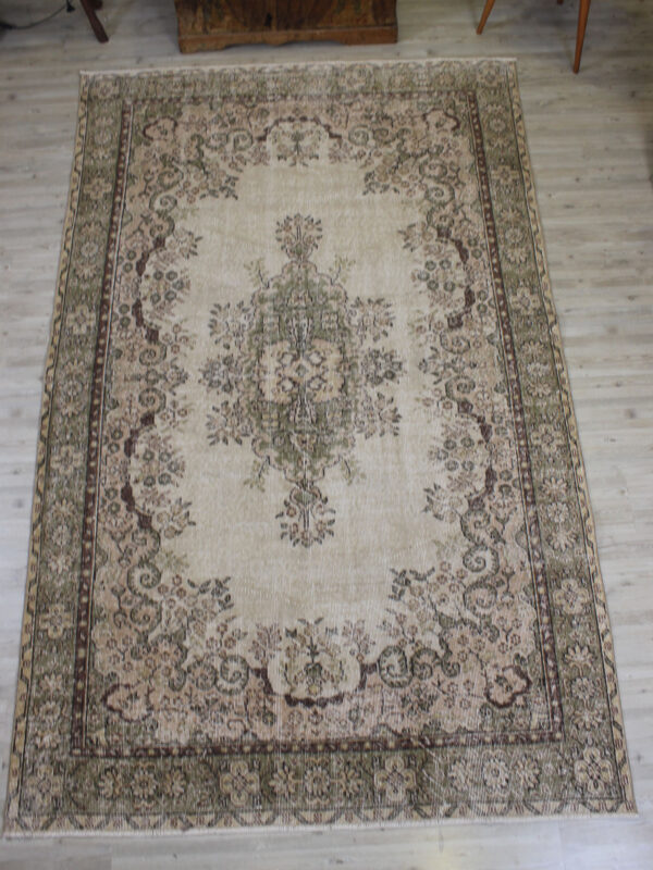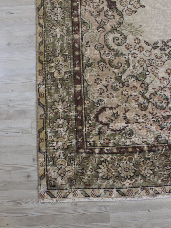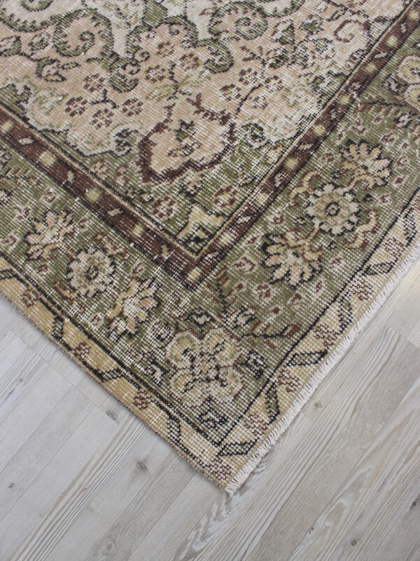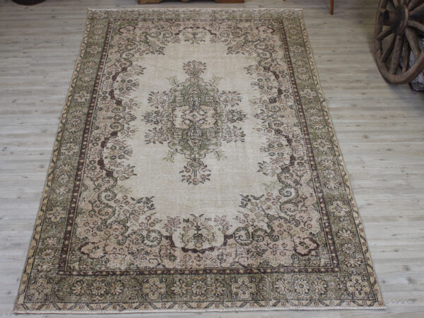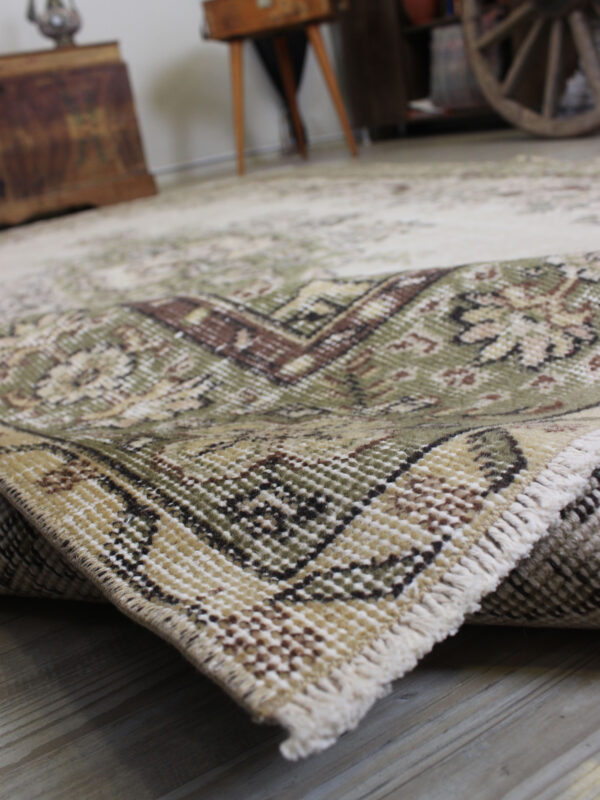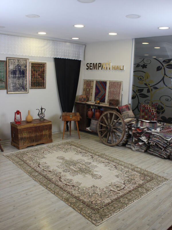 Anadolu’nun yüzyıllık el sanatları geleneğini yansıtan bu özel halı, 1980 öncesi tamamen el dokuması olarak hazırlanmıştır. Doğal yün ve pamuk ipliklerinden dokunan halı, geleneksel tekniklerle işlenmiş, traşlanıp temizlenerek modern vintage tarzına uygun hale getirilmiştir.