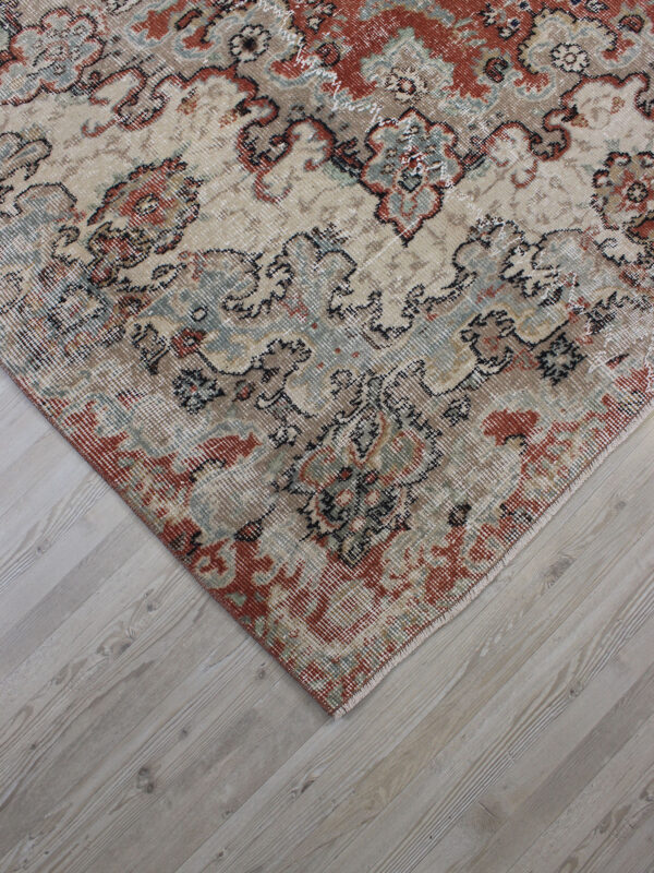 Anadolu’nun yüzyıllık el sanatları geleneğini yansıtan bu özel halı, 1980 öncesi tamamen el dokuması olarak hazırlanmıştır. Doğal yün ve pamuk ipliklerinden dokunan halı, geleneksel tekniklerle işlenmiş, traşlanıp temizlenerek modern vintage tarzına uygun hale getirilmiştir.