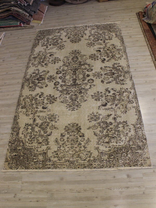 Anadolu’nun yüzyıllık el sanatları geleneğini yansıtan bu özel halı, 1980 öncesi tamamen el dokuması olarak hazırlanmıştır. Doğal yün ve pamuk ipliklerinden dokunan halı, geleneksel tekniklerle işlenmiş, traşlanıp temizlenerek modern vintage tarzına uygun hale getirilmiştir.